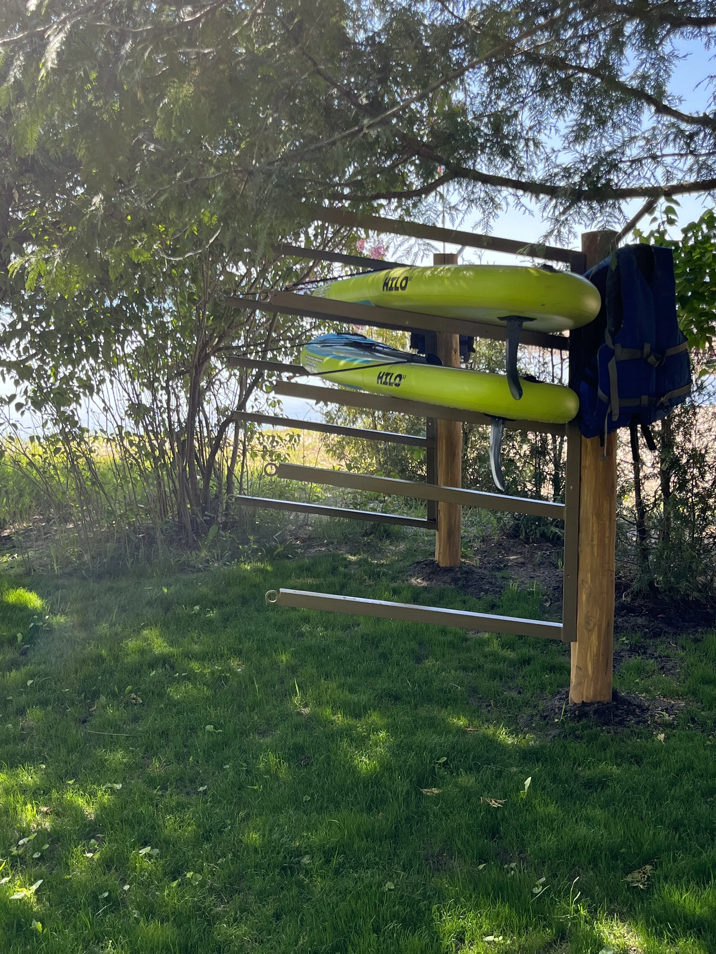 We have multiple paddle boards for guest use. Test your balance and take the family out around the lake or park them on our floating raft for a refreshing dip in the water.
