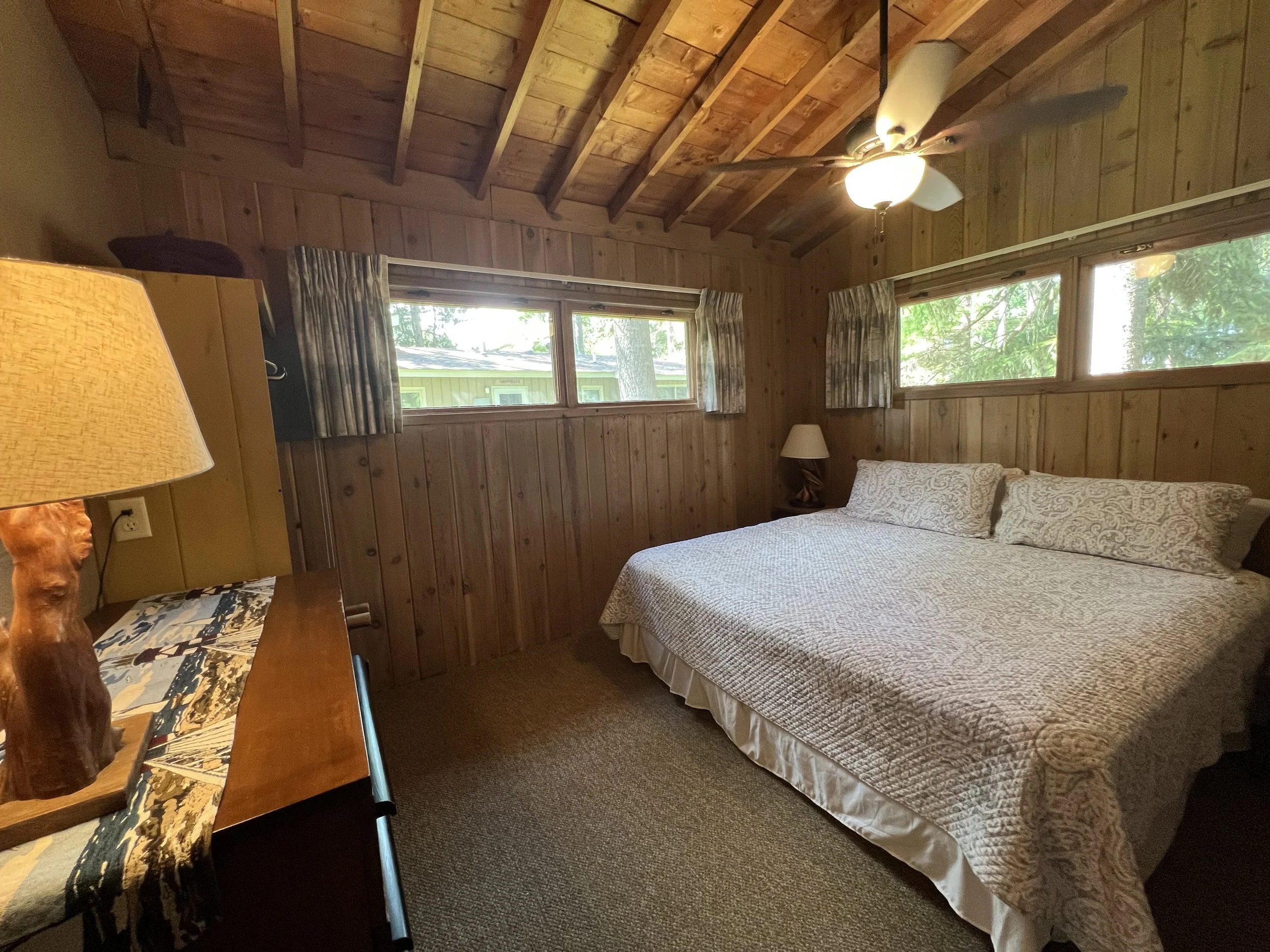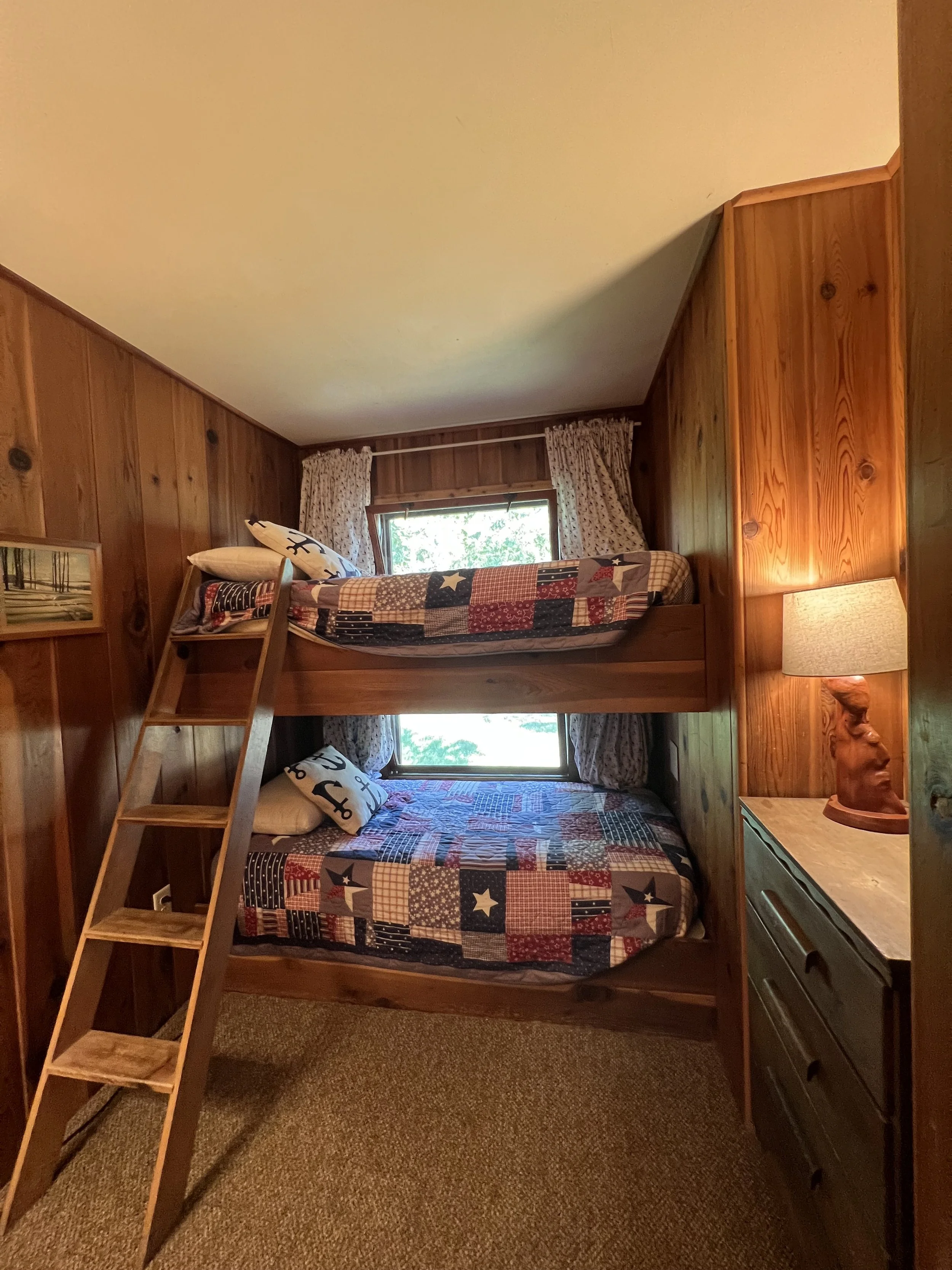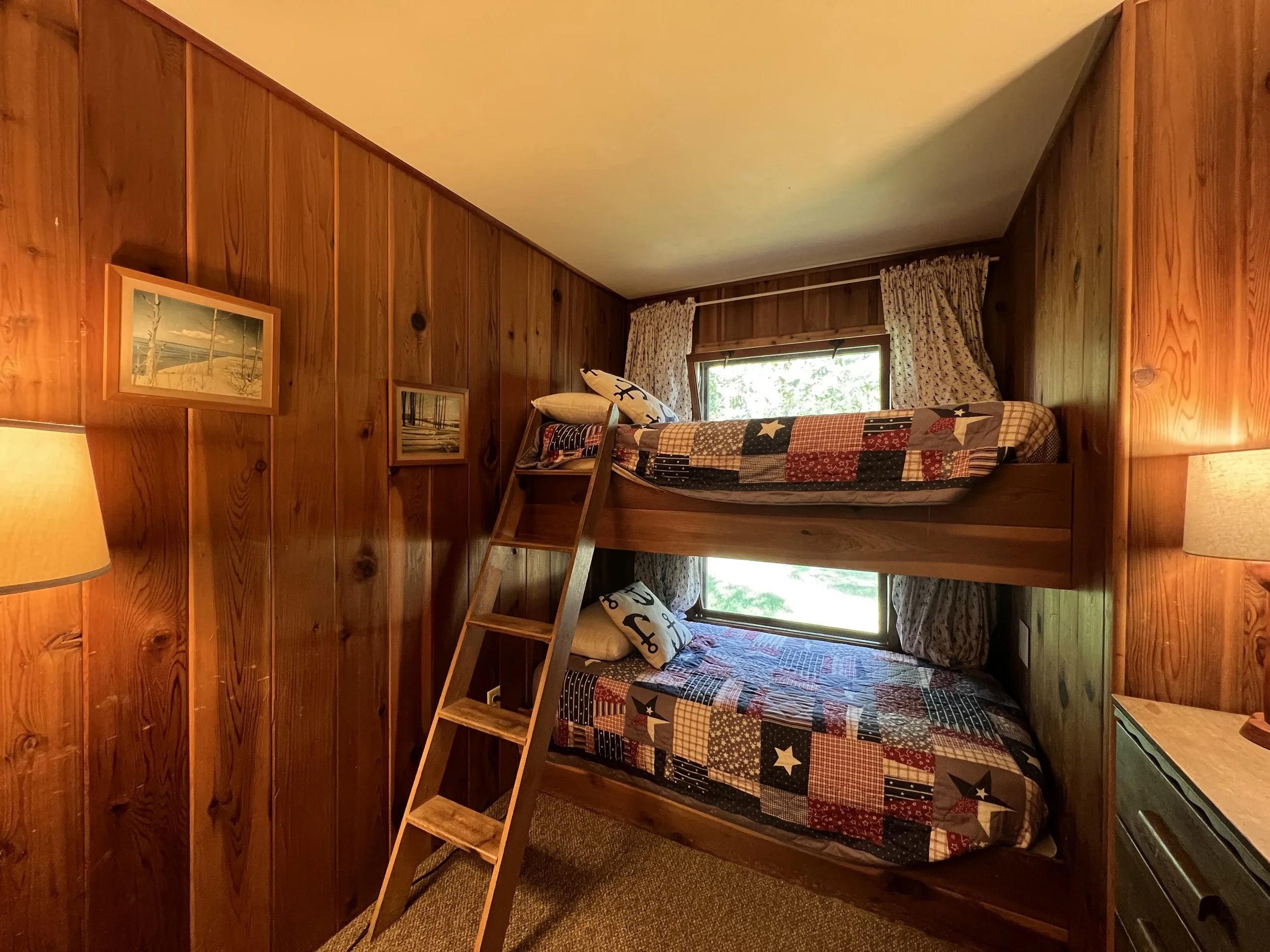 Driftwood features a full kitchen, combined living/dining room with wall of windows for pristine lake views, fireplace and vaulted ceilings, a full bath and three bedrooms: one with a queen size bed, one with twin bed, and one with built-in bunk beds. There is also a pull out queen size sofa bed.
