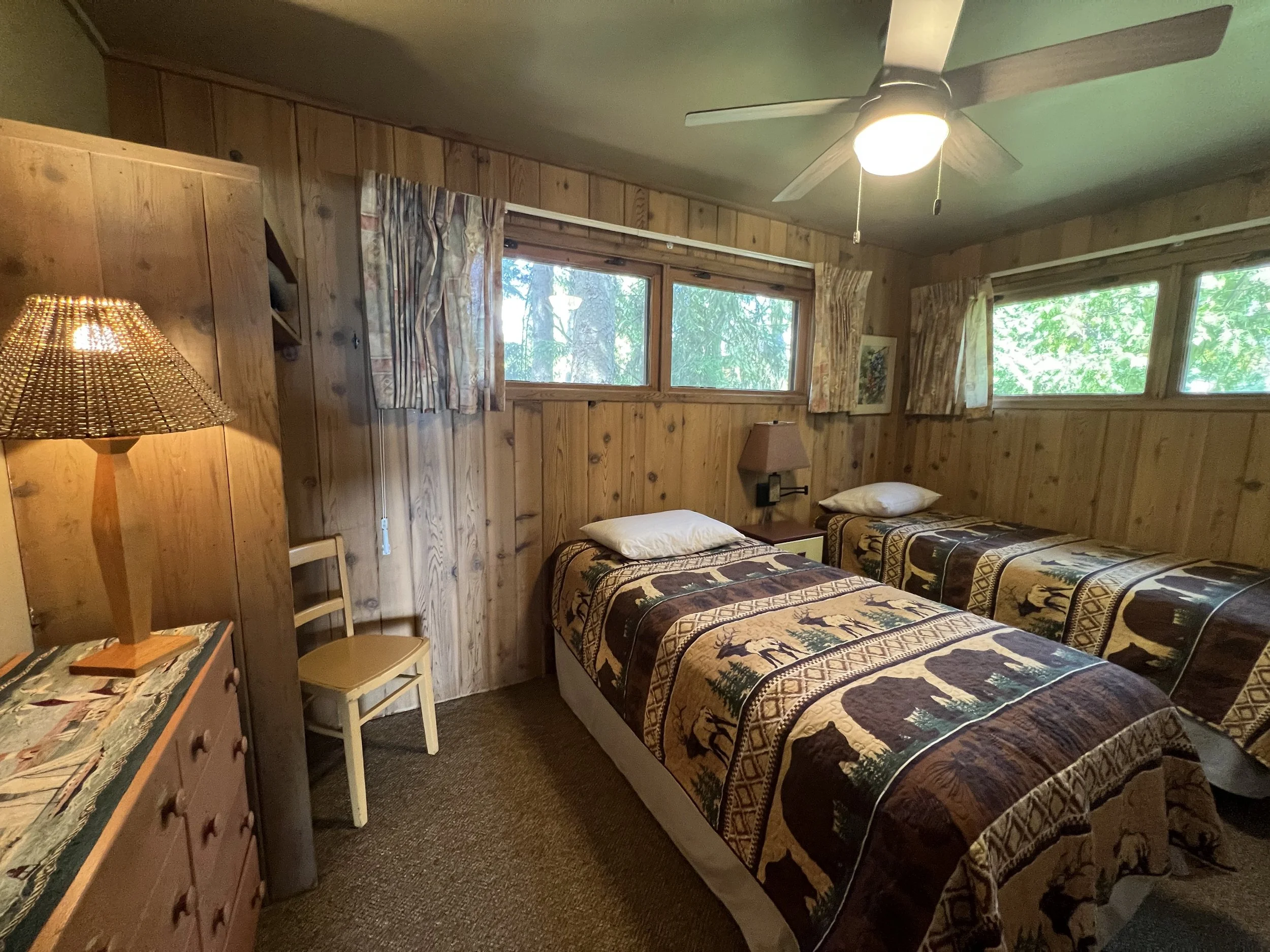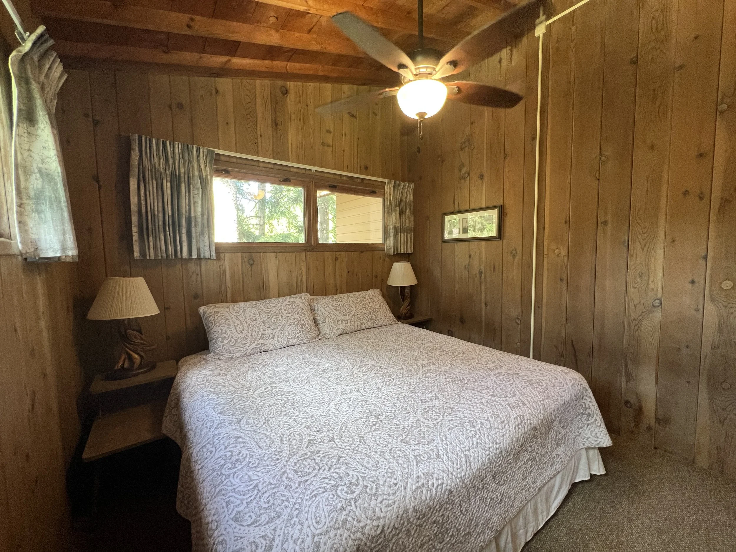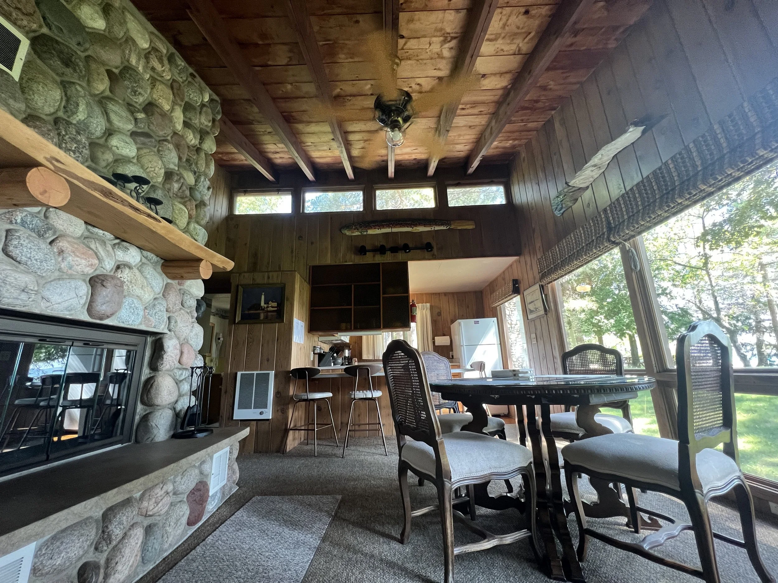 Driftwood features a full kitchen, combined living/dining room with wall of windows for pristine lake views, fireplace and vaulted ceilings, a full bath and three bedrooms: one with a queen size bed, one with twin bed, and one with built-in bunk beds. There is also a pull out queen size sofa bed.